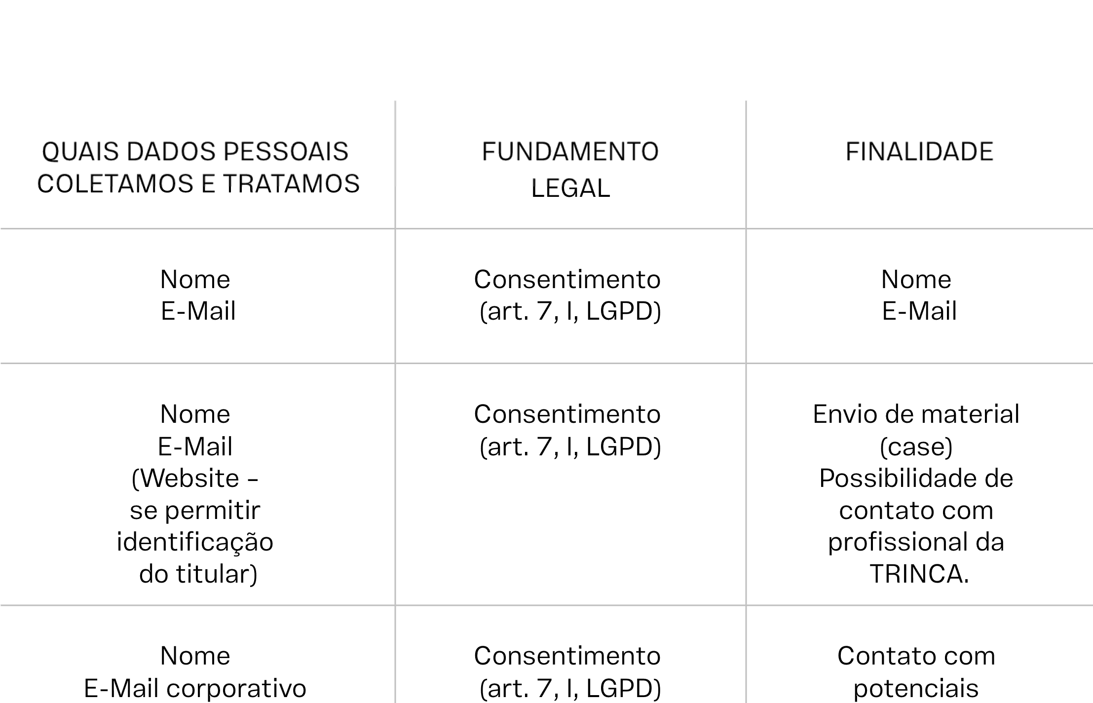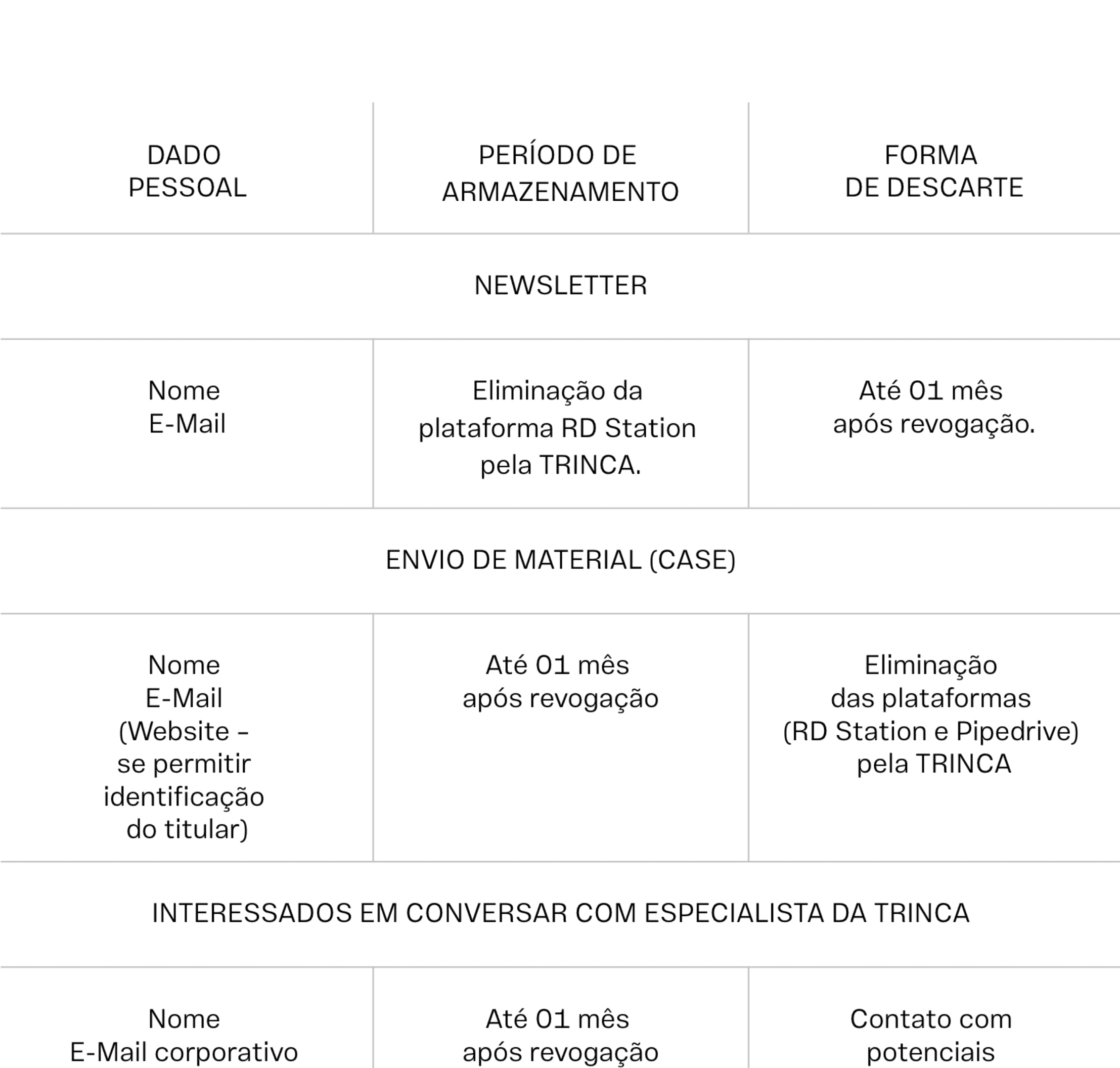 1. TRINCA has structured its operations so that personal data is not stored longer than necessary, that is, personal data is stored by TRINCA while consent has not been revoked.